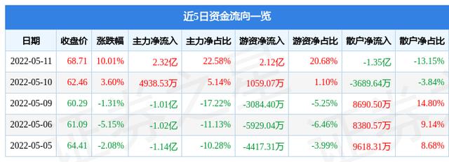 资金流向数据方面,5月11日主力资金净流入2.32亿元,游资资金净流入2.12亿元,散户资金净流出1.35亿元。