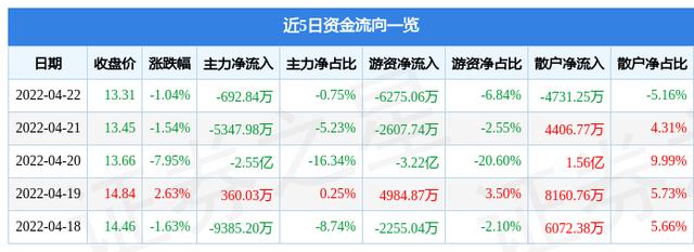 资金流向数据方面,上个交易日主力资金净流出692.84万元,游资资金净流出6275.06万元,散户资金净流出4731.25万元。近5日资金流向一览见下表: