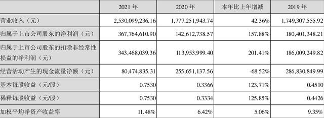 中证财讯 川恒股份(002895)4月16日披露2021年年度报告。2021年,公司实现营业总收入25.30亿元,同比增长42.36%;归母净利润3.68亿元,同比增长157.88%;扣非净利润3.43亿元,同比增长201.41%;经营活动产生的现金流量净额为8047.48万元,同比下降68.52%;报告期内,川恒股份基本每股收益为0.753元,加权平均净资产收益率为11.48%。公司2021年度分配预案为:拟向全体股东每10股派2元(含税)。