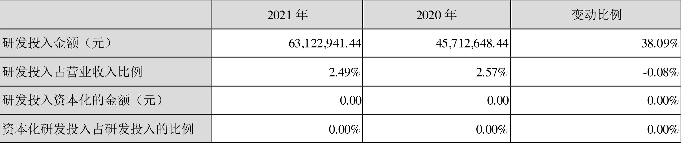 2021年全年,公司研发投入金额为6312.29万元,同比增长38.09%;研发投入占营业收入比例为2.49%,相比上年同期下降0.08个百分点。此外,公司全年研发投入资本化率为0。
