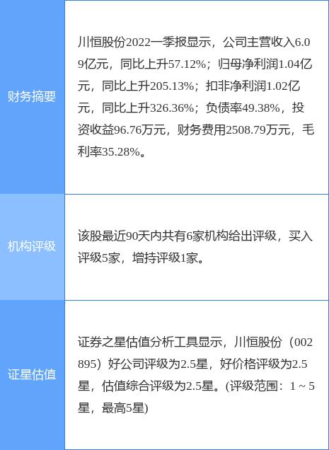 本文摘要:今日川恒股份(002895)盘中创60日新高,收盘报28.14元。2022年4月18日,国盛证券研究员王席鑫,罗雅婷发布了对川恒股份的研报《业绩符合预期,定增助力新能源领域布局》,该研报对川恒股份给出“买入”评级。研报中预计公司2022~2… …