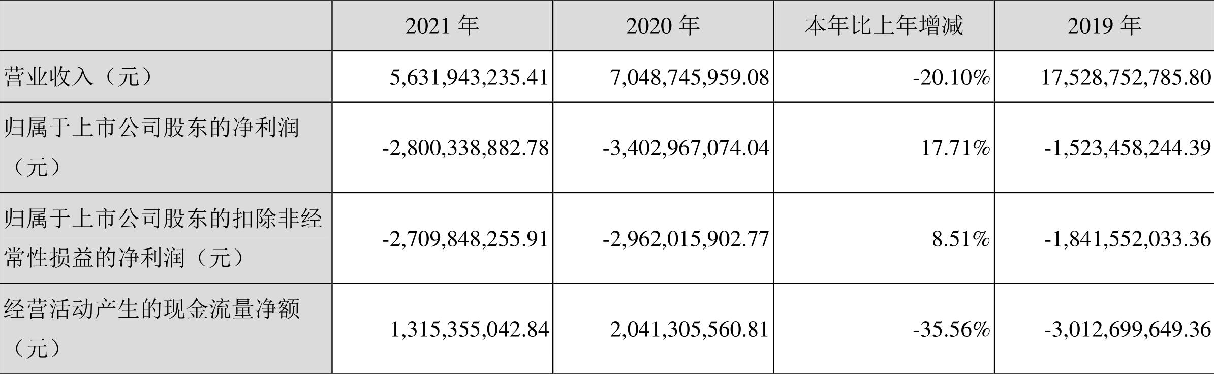 中证财讯 东旭光电(000413)4月30日披露2021年年度报告,公司实现营业总收入56.32亿元,同比下降20.10%;归母净利润亏损28.00亿元,上年同期亏损34.03亿元;扣非净利润亏损27.10亿元,上年同期亏损29.62亿元;经营活动产生的现金流量净额为13.15亿元,同比下降35.56%;基本每股收益为-0.49元,加权平均净资产收益率为-10.65%。