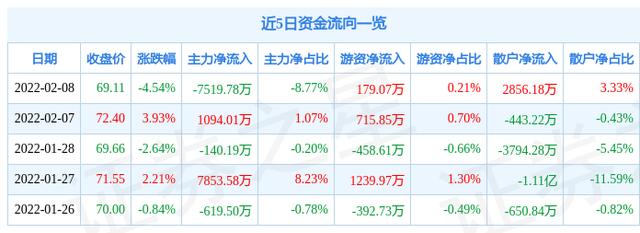 资金流向数据方面,上个交易日主力资金净流出7519.78万元,游资资金净流入179.07万元,散户资金净流入2856.18万元。近5日资金流向一览见下表: