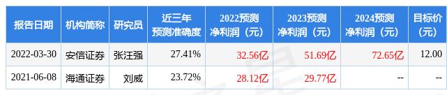 证券之星数据中心根据近三年发布的研报数据计算,安信证券张汪强研究员团队对该股研究较为深入,近三年预测准确度均值为27.41%,其预测2022年度归属净利润为盈利32.56亿,根据现价换算的预测PE为9.36。