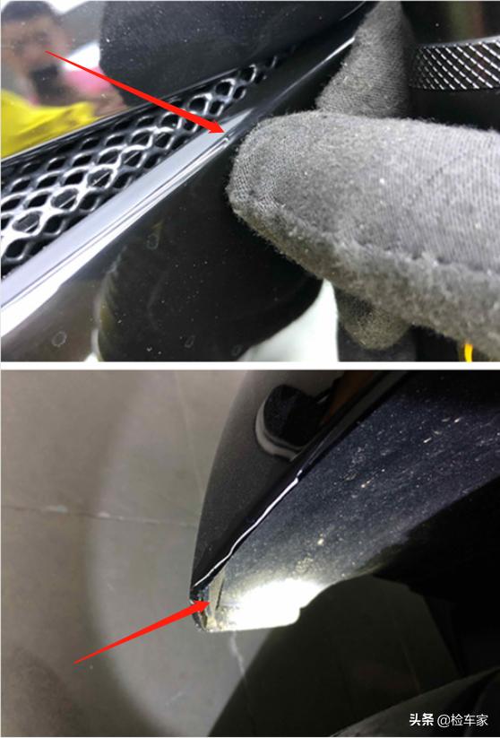 接着检查前后保险杠缝隙内存在明显二次喷漆后残留的飞漆,且通过其他部位可以确定前保险杠存在拆卸现象,但并无更换。