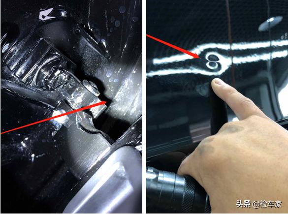 注意看左前门铰链,连接螺丝处有喷漆,应该是车门喷漆造成的,不过并未钣金,应该存在擦挂或者碰到了什么坚硬物体。同时车门上还有一处凹陷,这瑕疵看着真不舒服,这好歹也是辆超跑啊,车行你也稍微的修复一下下嘛。
