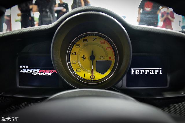 本次实拍的488 Pista Spider选装了全碳纤维仪表,黄色表盘很有辨识度,两侧的液晶屏可以显示更多信息,甚至取代了传统车型的中控屏。