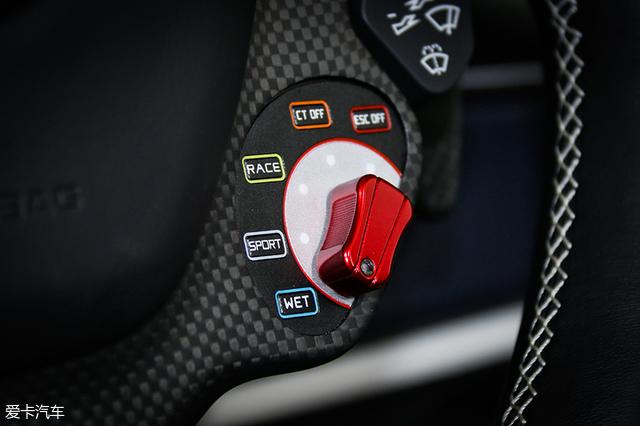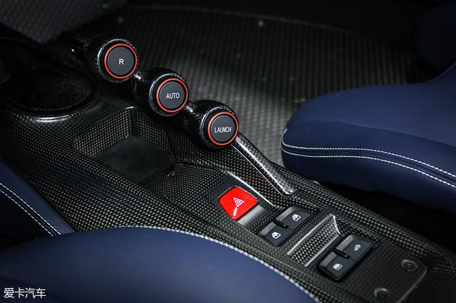 倒挡、自动挡与弹射按键位于全碳纤维“挡杆”上,这种从中控地台伸出的设计可以进一步减轻重量。