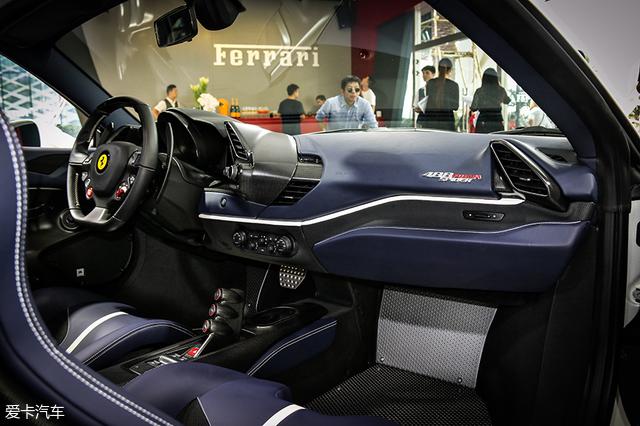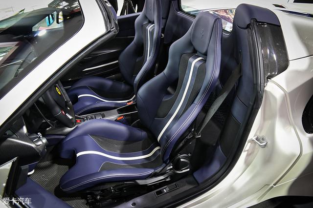 488 Pista Spider的一体式运动座椅比488 Spider更薄、更硬、更有战斗气息,蓝黑配色与内饰相呼应,视觉效果不错。