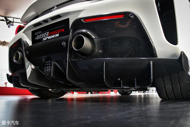 车尾依然是熟悉的圆灯+圆排气尾喉,与488 Spider相比,488 Pista Spider的扰流板加高了30mm,加长了40mm,最终提升了25%的下压力。