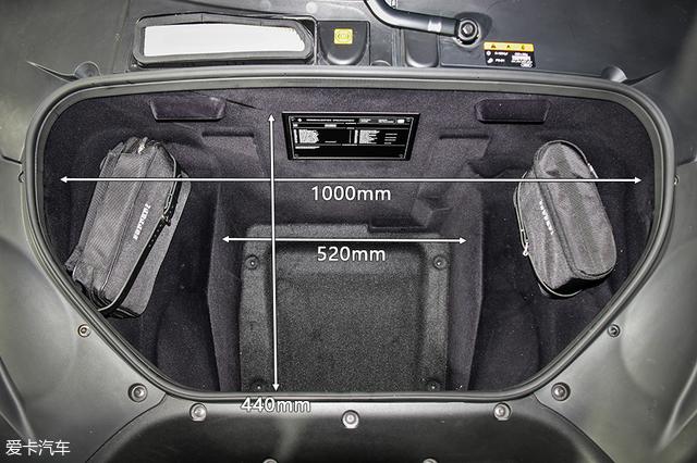 前置行李厢的空间出乎意料,尤其纵向深度可以容纳大尺寸物品。原厂工具包与补胎套装位于厢内两侧,并由皮带捆扎固定。