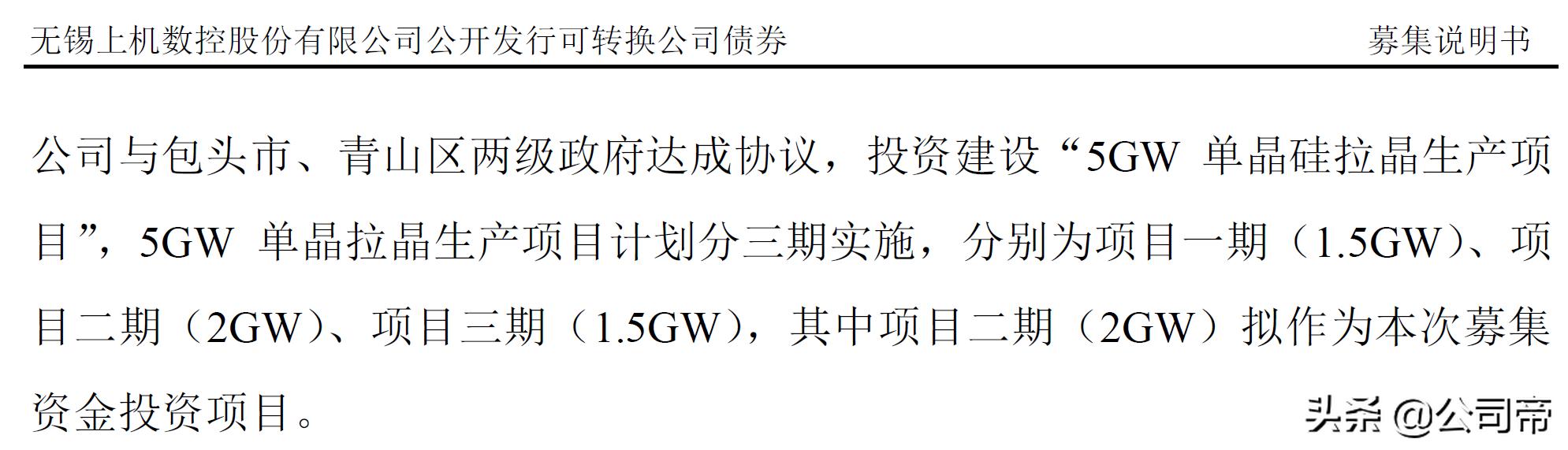 2020年6月9日,公司发行可转债665万张,筹集募集资金净额6.54亿元,6年期。募集资金全部用于包头5GW单晶硅拉晶项目(二期),这是用多晶硅拉成单晶硅的项目,做的是单晶硅产品,而不仅仅是生产设备了,单晶硅是光伏行业的“核心材料”。该5GW单晶拉晶生产项目分三期实施,项目一期为1.5GW,项目二期为2GW,项目三期为1.5GW。此次可转债募集资金要做的就是二期2GW工程。从此,上机数控走上了“高端装备+和新材料产品”的双轮驱动的道路。