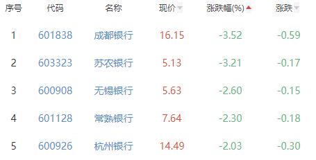成都银行、苏农银行、无锡银行、常熟银行杭州银行位列涨幅榜后五位,涨幅分别为-3.52%、-3.21%、-2.60%、-2.30%、-2.03%。