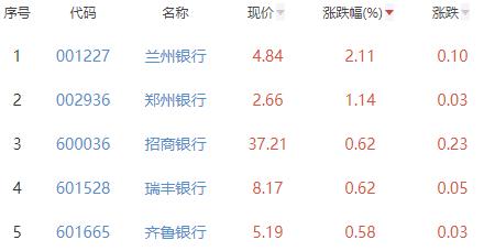 其中,兰州银行郑州银行招商银行、瑞丰银行、齐鲁银行位列板块涨幅前五位,涨幅分别为2.11%、1.14%、0.62%、0.62%、0.58%。