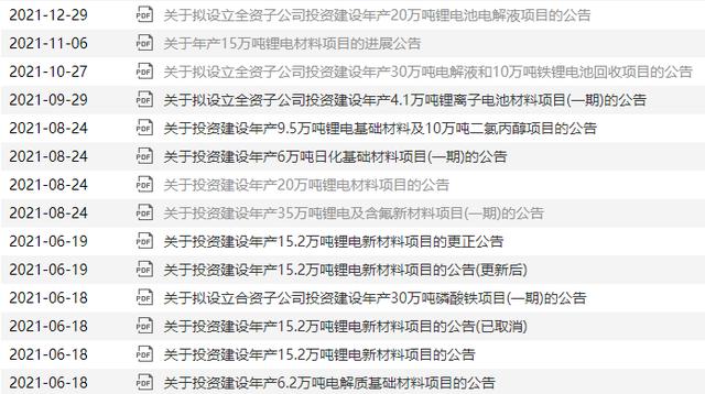 再往前的2021年6月,天赐材料计划投资超20亿元,建设三个项目,包括年产30万吨磷酸铁项目(一期)”、年产15.2万吨锂电新材料项目和年产6.2万吨电解质基础材料项目。