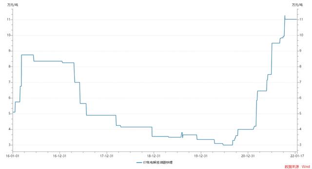 电解液价格曾走出“V”型反转,由2017年底的5万元/吨跌至3万元/吨,后回升并于2021年10月突破11万元/吨关口,至今仍保持高位。