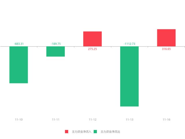 昨日(2020-11-13)该股净流出金额-1250.14万元,主力净流出-1097.69万元,中单净流出-314.44万元,散户净流入161.99万元。