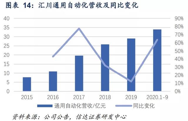 汇川技术通用自动化业务营收的变化及同行业的对比就一目了然。信达证券研报显示,2015-2019年汇川技术通用自动化业务营收复合增速达到39%,明显领先于行业8%的水平。但这期间汇川技术的营收增速是有较大波动的。而且从市场份额看,目前没有任何一家企业占有绝对优势。行业集中度低既意味着机会,稍有不慎也可能会掉队。