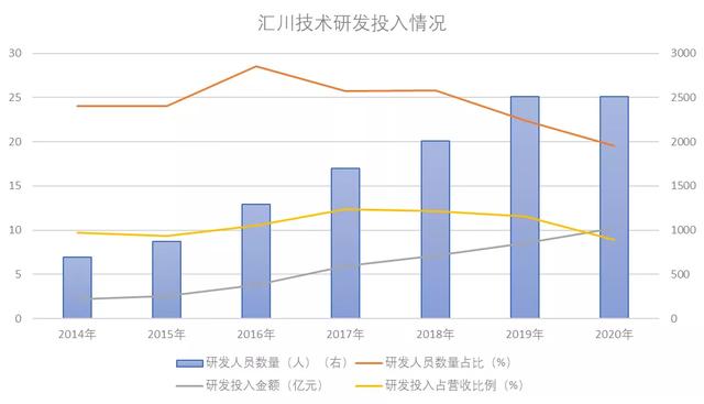 汇川技术研发投入规模逐年增加,从2014年的2.17亿元增长至2020年的10.23亿元;研发人员数量从2014年的694人增加至2020年的2513人。不过,虽然研发人员数量占比依然处于较高水平,却已经从2016年的28.5%下降至2020年的19.53%。研发投入金额占营收的比例也已经连续三年下滑。
