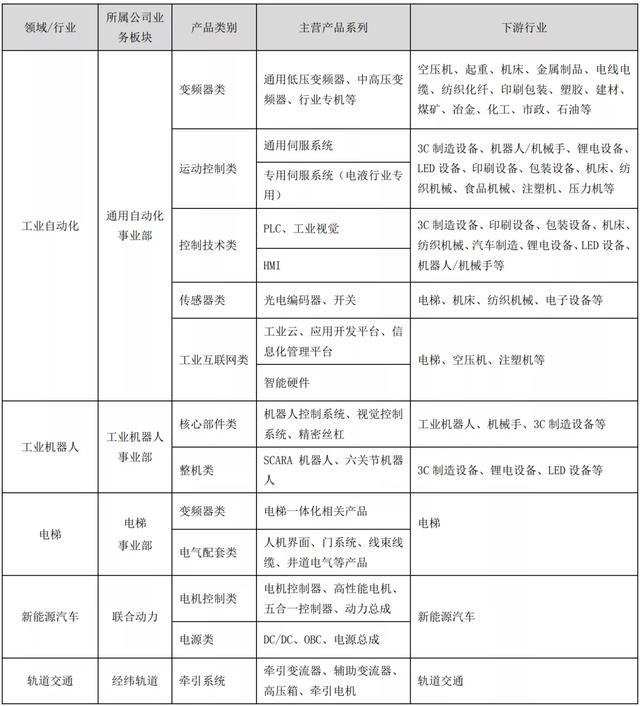 除了变频器和伺服系统,汇川技术的产品还包括控制系统、工业机器人等十余种,总体可分为工业自动化系统和电驱及电源系统。所属行业包括工业自动化、工业机器人、电梯、新能源汽车和轨道交通五大类。