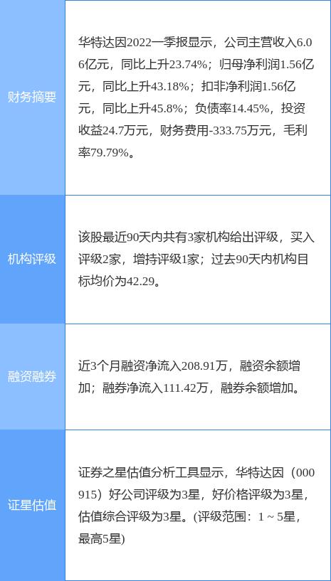 本文摘要:今日华特达因(000915)盘中创60日新高,收盘报39.79元。2022年4月15日,光大证券研究员黄素青,林小伟发布了对华特达因的研报《2022年一季报点评:Q1业绩开门红,聚焦主业势能强劲》,该研报对华特达因给出“买入”评级。证券之星… …