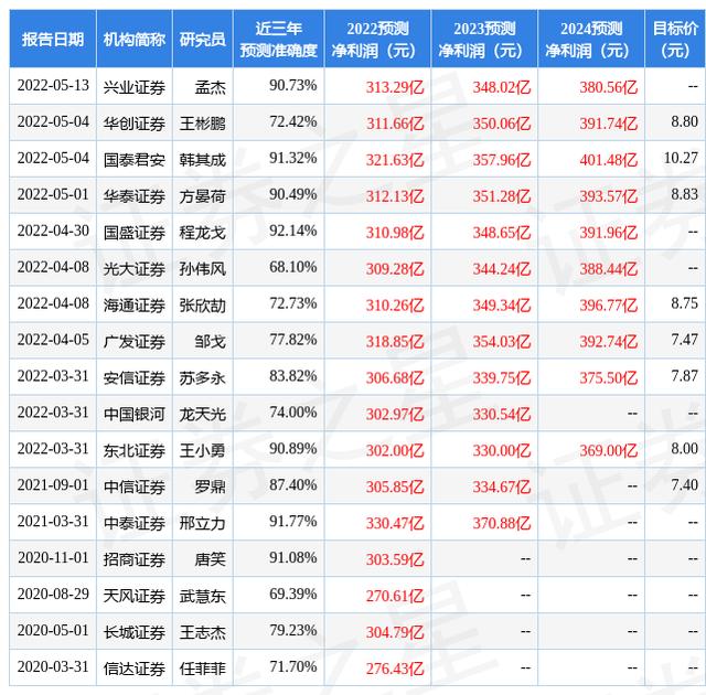 证券之星数据中心根据近三年发布的研报数据计算,国盛证券程龙戈研究员团队对该股研究较为深入,近三年预测准确度均值高达92.14%,其预测2022年度归属净利润为盈利310.98亿,根据现价换算的预测PE为5.56。