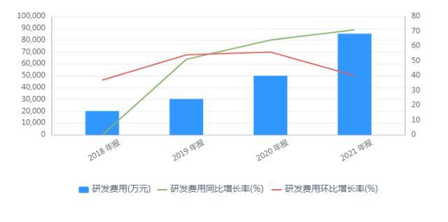 2021年,加权净资产收益率(ROE)为21.45%,相较2020年的27.23%出现明显回落,同时21.45%也是最近五年中倒数第二,仅仅比2018年高。2021年投入研发费用8.54亿元 同比增长71%。