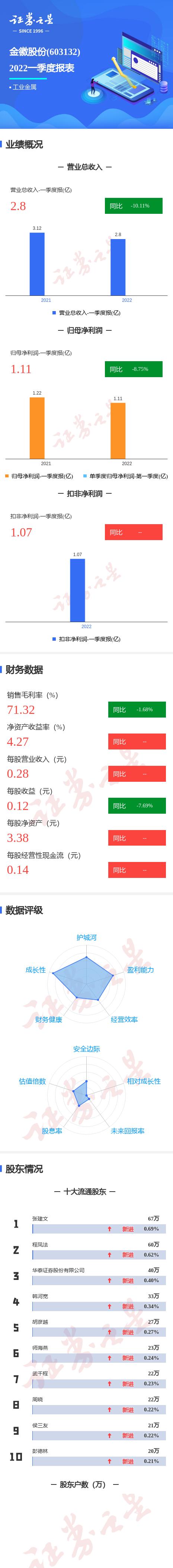 本文摘要:金徽股份2022一季报显示,公司主营收入2.81亿元,同比下降10.11%;归母净利润1.12亿元,同比下降8.75%;扣非净利润1.07亿元,其中2022年第一季度,公司单季度主营收入2.81亿元,同比下降10.11%;单季度归母净利润1… …