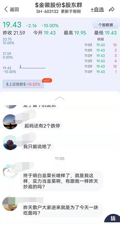 在尺度APP的金徽股份股东群,有投资者表示,“伤心透了!终于明白韭菜长啥样了,就是我这样实力当韭菜啊,有跟我一样昨天抄底的吗?”