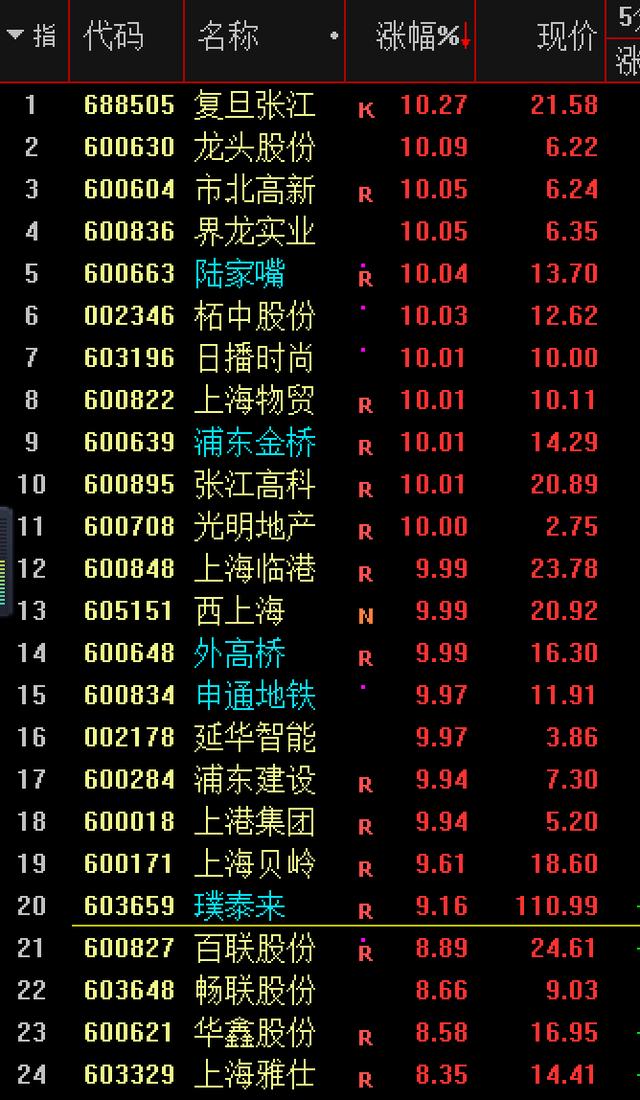 午后,这股势头延续,龙头股份(600630.SH)、市北高新(600604.SH)、界龙实业(600836.SH)、上海物贸(600822.SH)、张江高科(600895.SH)、光明地产(600708.SH)、上海临港(600848.SH)、西上海(605151.SH)、外高桥(600648.SH)、浦东建设(600284.SH)、上港集团(600018.SH)、百联股份(600827.SH)等标的吹响了冲锋的号角,在下午开盘不久,均纷纷涨停,一下子将市场的注意力都拉了过来。