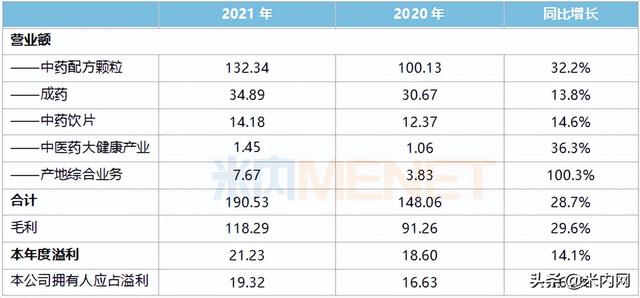 2020年中国中药的中药配方颗粒业务收入突破100亿元,2021年再创新高,同比增长超过30%,占总收入比例70%。中国中药表示,集团紧抓中药配方颗粒标准转换过渡期,积极组织国标和省标品种的上市备案、跨省备案和产销协同,全力以赴保障中药配方颗粒全品种供应,进一步扩大市场占有率,巩固中药配方颗粒行业领导者地位。同时,还对江阴天江和广东一方实施股权和业务结构的优化重组,进一步释放两者市场竞争活力。值得一提的是,中国中药在2019年中报开始,从中药配方颗粒板块划分出产地综合业务板块,产地综合业务2020年收入已超过3亿元,而2021年则实现翻倍。