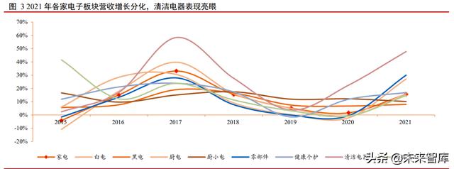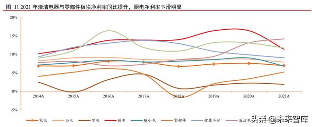 营业总收入增速方面,2021 年家电各子板块呈现一定分化。年报数据显示,家电样 本企业整体 2021 年营收增速+15.59%,较 2019 年同期+17.44%,已恢复至疫情前水平, 其中白电板块 2021 年营收增速+15.85%(较 2019 同期+15.02%);黑电板块 2021 年营收增速+7.94%(较 2019 同期+15.21%);厨电板块受益于集成灶高景气 2021 年营收增 速+27.06%(较 2019 同期+24.32%);厨房小家电板块在 2020 年疫情导致的小家电需求 高基数背景下 2021 年营收增速+10.12%(较 2019 同期+23.52%);健康个护家电板块 2021 年营收增速+16.86%(较 2019 同期+30.64%);清洁电器受益于消费升级以及洗地 机等新品市场快速扩容,板块 2021 年营收增速+47.74%(较 2019 同期+80.92%);照明 电工板块在地产数据承压以及企业渠道深耕综合影响下实现稳健增长,2021 年营收增 速+14.61%(较 2019 同期+13.72%);家电零部件板块在全球疫情之下产业链优势凸显实 现较快增长,2021 年营收+29.93%(较 2019 同期+29.27%)。