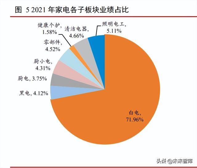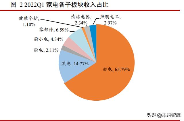 从选取的 61 家家电上市公司数据来看,2021 年样本合计营业总收入 13402 亿元, 同比增长 15.59%。其中,主要收入贡献来自白电子板块,2021 年样本总收入中白电板 块收入占比 63.50%。2021Q4/2022Q1 家电样本总体营收 3494 亿/3196 亿,同比增速分 别为+8.09%/+6.74%,2022Q1 增速环比下降,其中白电子板块相对稳健,收入占比提升 至 65.79%,黑电、健康个护子板块受上年同期基数及今年疫情扰动原因增速环比下降明 显,占比有所下降。