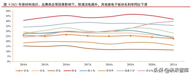 归母净利润增速方面,2021 年度受原材料及海运费价格波动、地产“暴雷”、新兴 赛道景气度高涨等多方面因素影响,家电各细分板块业绩增速分化明显。年报数据显示, 家电样本企业整体 2021 年业绩增速+9.06%,较 2019 年同期+16.06%,其中白电板块 2021 年业绩增速+9.26%(较 2019 年同期+11.08%);黑电板块受赛事周期与原材料价格 波动影响 2021 年业绩增速-14.97%(较 2019 年同期+30.53%);厨电板块虽然集成灶持 续高景气,但原材料成本压力明显,同时老板电器受恒大相关应收账款坏账减值等因素 影响业绩承压,厨电板块 2021 业绩增速-11.54%(较 2019 年同期-13.15%);厨小电板块 因原材料涨价、海运费提升、需求偏弱等多方面影响,2021 年业绩增速-15.87%(较 2019 年同期-1.32%);健康个护板块受汇率及原材料价格波动影响,2021 年业绩增速+4.85% (较 2019 年同期+8.33%);清洁电器板块受益行业扩容及新品迭代转嫁成本压力 2021 年业绩增速亮眼,同比+59.54%(较 2019 年同期+171.04%);照明电工板块受原材料价 格提升影响,2021 年业绩同比微增 2.4%(较 2019 年同期+1.14%)。