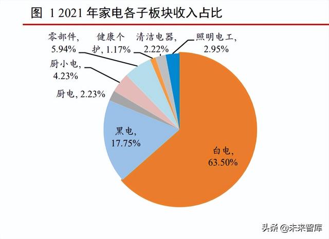 家电目前约占全部 A 股总市值 1.84%。我们选择家电行业中 61 只有代表性股票作 为分析样本,将家电行业分为白电、黑电、厨电、厨小电、健康个护、清洁电器、照明 电工、家电零部件 8 个细分行业,按照 2022 年 5 月 13 收盘价计算总市值为 14992.9 亿 元,占沪深两市 A 股总市值 1.84%。