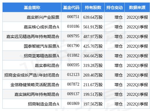 根据2022Q1季报基金重仓股数据,重仓该股的基金共100家,其中持有数量最多的基金为嘉实新兴产业股票。嘉实新兴产业股票目前规模为81.04亿元,最新净值3.436(4月26日),较上一交易日上涨0.67%,近一年下跌35.81%。该基金现任基金经理为归凯。归凯在任的公募基金包括:嘉实泰和混合,管理时间为2016年3月10日至今,期间收益率为94.55%;嘉实增长混合,管理时间为2018年12月4日至今,期间收益率为74.68%;嘉实瑞和两年持有期混合,管理时间为2020年4月9日至今,期间收益率为-5.75%。