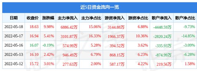 资金流向数据方面,5月18日主力资金净流入6886.42万元,游资资金净流入3144.88万元,散户资金净流出4448.59万元。