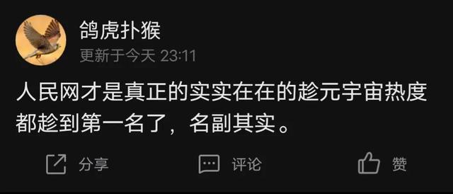 一时间,各种调侃,叫骂的帖子挤爆了人民网的股吧,这也就不难理解,为什么人民网的人气飙升到第一位的原因了吧,东方财富股吧人气榜一般是涨的多的股票排第一,这种被骂上第一的实属罕见。可能是由于被骂的理亏了,现在那篇中午的稿件已经不见踪影,而且人民网好像是为了原场,下午十七点,自己也发了一篇片介绍元宇宙早期发展史的文章,简直让人哭笑不得。