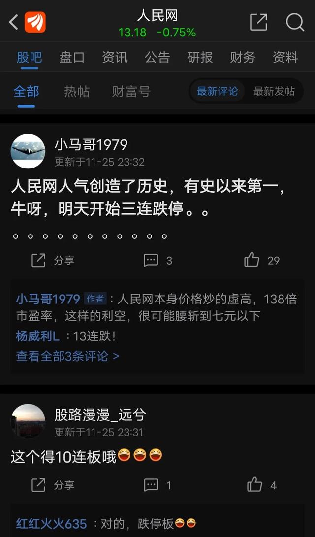 有时看看股友的评论也挺有趣的,我截图了一些精彩发言给吃瓜群众们欣赏。我更加好奇的是如此的人气第一,明天开盘,人民网的走势会如何呢?