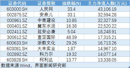 Wind提供的数据显示,本周获主力资金持续净流入且五日累计净流入额超过1亿元的个股共有10只,较上周减少9只。其中,人民网(603000.SH)、安奈儿(002875.SZ)、中南建设(000961.SZ)本周累计净流入额居前,分别为4.31亿元、3.26亿元、3.23亿元。