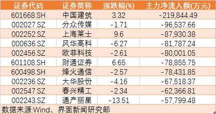 在本周主力资金持续净流出个股中,共计111只个股累计主力资金净流出额超过1亿元。这其中,中国建筑(601668.SH)、分众传媒(002027.SZ)、上海莱士(002252.SZ)等个股本周遭主力抛售幅度最大,其累计净流出额分别为21.98亿元、9.65亿元、8.79亿元。