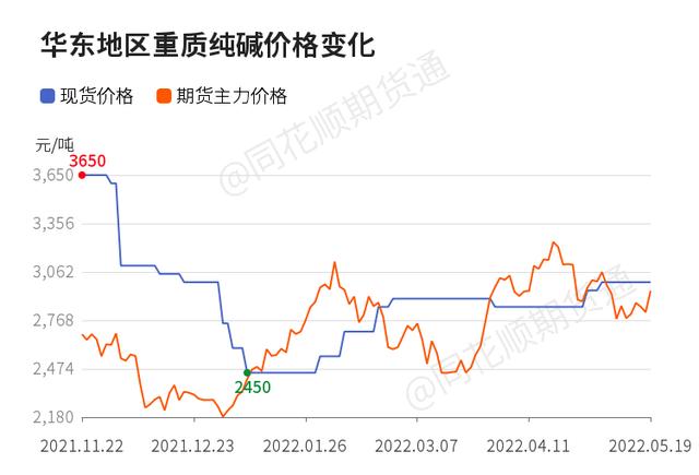 5月19日华东地区重质纯碱现货价格报价3000.00元/吨,相较于期货主力价格(2947.00元/吨)升水53.00元/吨。