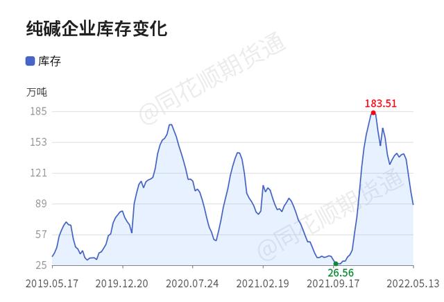 5月13日纯碱企业库存录得87.70万吨,较上一交易日减少13.85万吨。