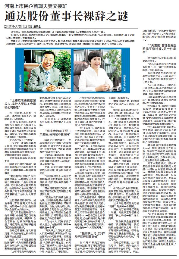 本文摘要:大河报·大河财立方记者 唐朝金这个秋天,河南通达电缆股份有限公司(以下简称通达股份)掌门人更替出现令人关注一幕。10月27日晚间,通达股份创始人史万福辞职,董事长一职交由共同创业32年的妻子马红菊接任。与此同时,其子史家宝也正式成为公司副董… …