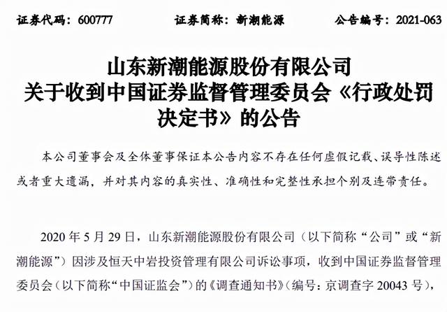 本文摘要:山东新潮能源股份有限公司(新潮能源,600777)在2021年12月25日发布了关于收到中国证券监督管理委员会《行政处罚 决定书》的公告。公告内容显示,证监会依据新潮能源违法行为的事实、性质、情节与社会危害程度,对其责令改正给予警告并罚款3… …