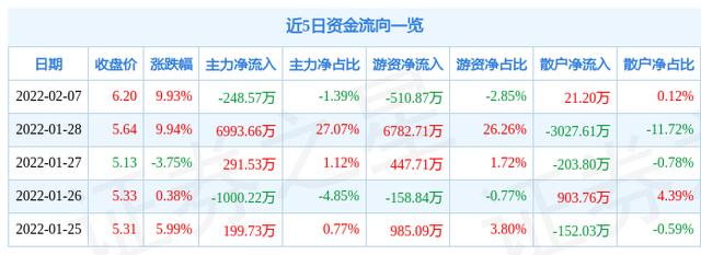 资金流向数据方面,当日主力资金净流出248.57万元,游资资金净流出510.87万元,散户资金净流入21.2万元。近5日资金流向一览见下表: