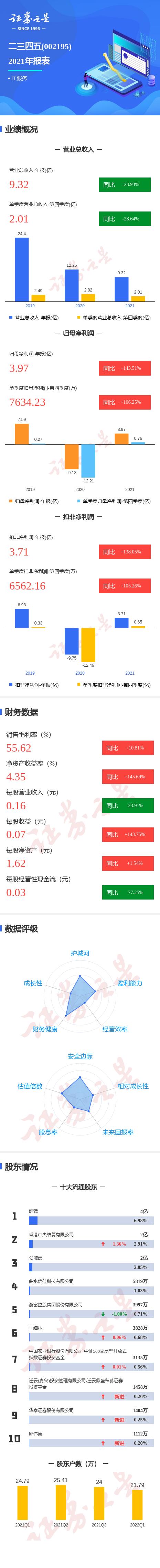 本文摘要:二三四五2021年报显示,公司主营收入9.32亿元,同比下降23.93%;归母净利润3.97亿元,同比上升143.51%;扣非净利润3.71亿元,同比上升138.05%;其中2021年第四季度,公司单季度主营收入2.01亿元,同比下降28…. …