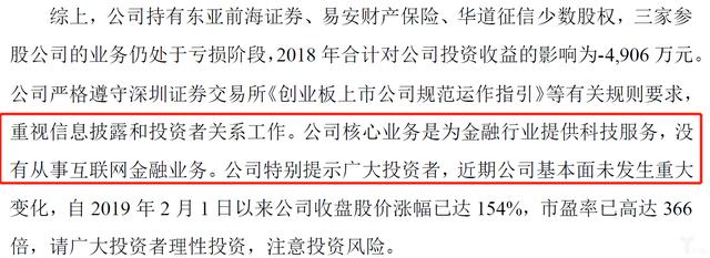 银之杰一直将自己定位为一家金融科技服务公司,受此影响,备受二级市场投资者青睐。自2019年以来,银之杰股价一路飙升,特别是从2月1日至3月6日,其股票收盘价从7.61元/股上涨至19.32元/股,区间涨幅高达154%,市盈率已高达366倍。对此,2019年3月5日,深交所出具关注函,其中要求银之杰核实说明股价上涨是否与互联网金融概念炒作有关。3月6日晚间,银之杰发布对深交所关注函的回复公告称,公司核心业务是为金融行业提供科技服务,没有从事互联网金融业务。