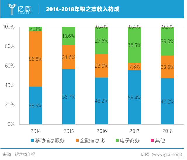 由于业绩连续下滑,2014年银之杰斥资3亿收购企业移动商务平台亿美软通100%股权。自此,银之杰正式形成金融信息化、移动信息服务、电子商务三足鼎立的业务体系架构。