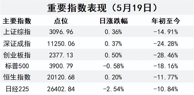 5月19日,大盘全天低开高走,三大指数均小幅上涨。截止收盘,沪指涨0.36%,深成指涨0.37%,创业板指涨0.5%。板块方面,风电、房地产服务、光伏等板块涨幅居前,互联网电商、油气开采、猪肉、食品加工等板块跌幅居前。